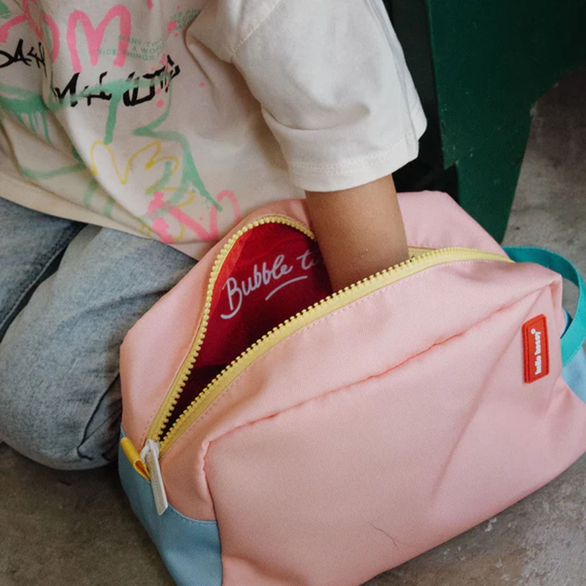 Die Kulturtasche für Kinder besteht aus recyceltem Polyester und überzeugt durch ihren wasserabweisenden Stoff – ideal für unterwegs. Im Inneren bietet ein integriertes Netzfach praktische Aufbewahrungsmöglichkeiten für kleine Pflegeartikel. Dank der handlichen Trageschlaufe lässt sich die Tasche leicht transportieren, während der breite Reißverschluss ein einfaches Öffnen und Schließen ermöglicht.