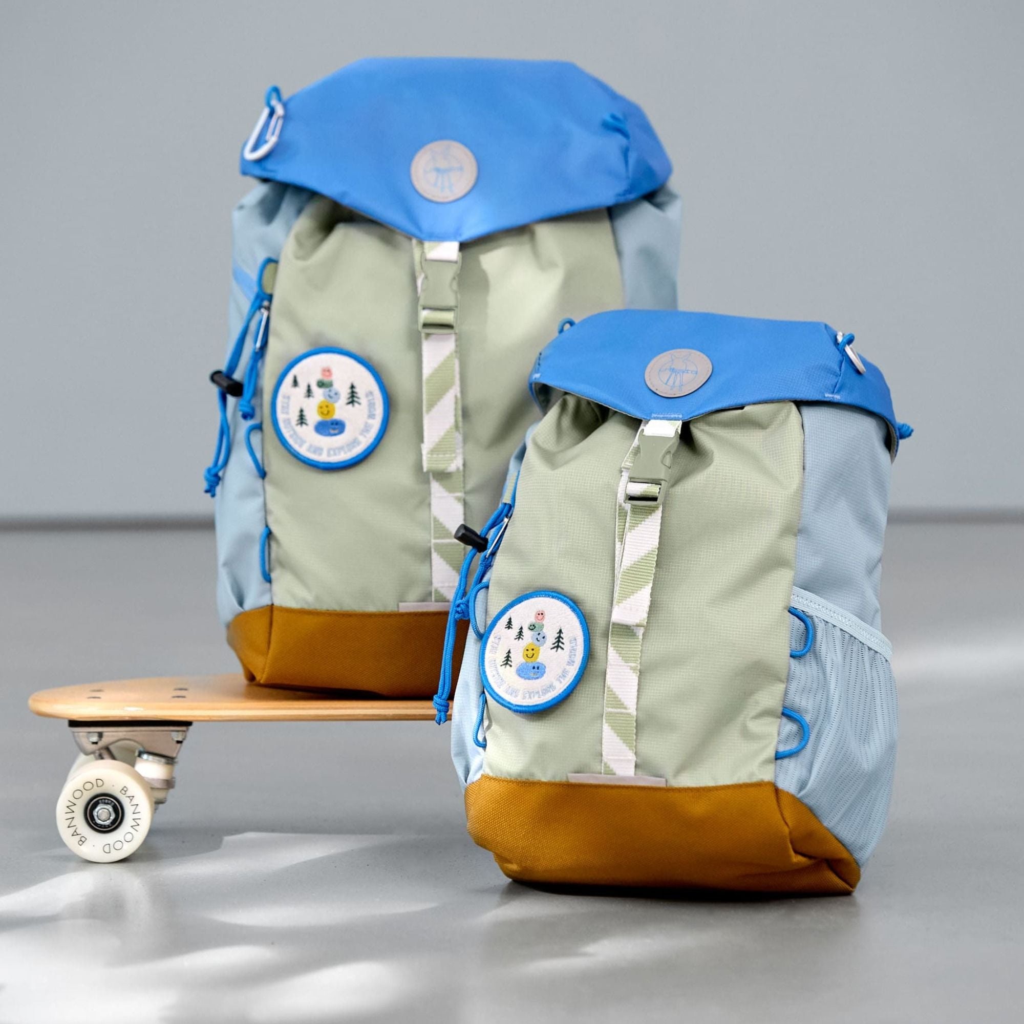Durch bunte, austauschbare Patches lässt sich der Rucksack individuell gestalten. Zusätzliches Zubehör wie ein integrierter Regenschutz, eine thermoisolierte Sitzunterlage, ein Karabiner und ein Patch runden die Ausstattung ab.