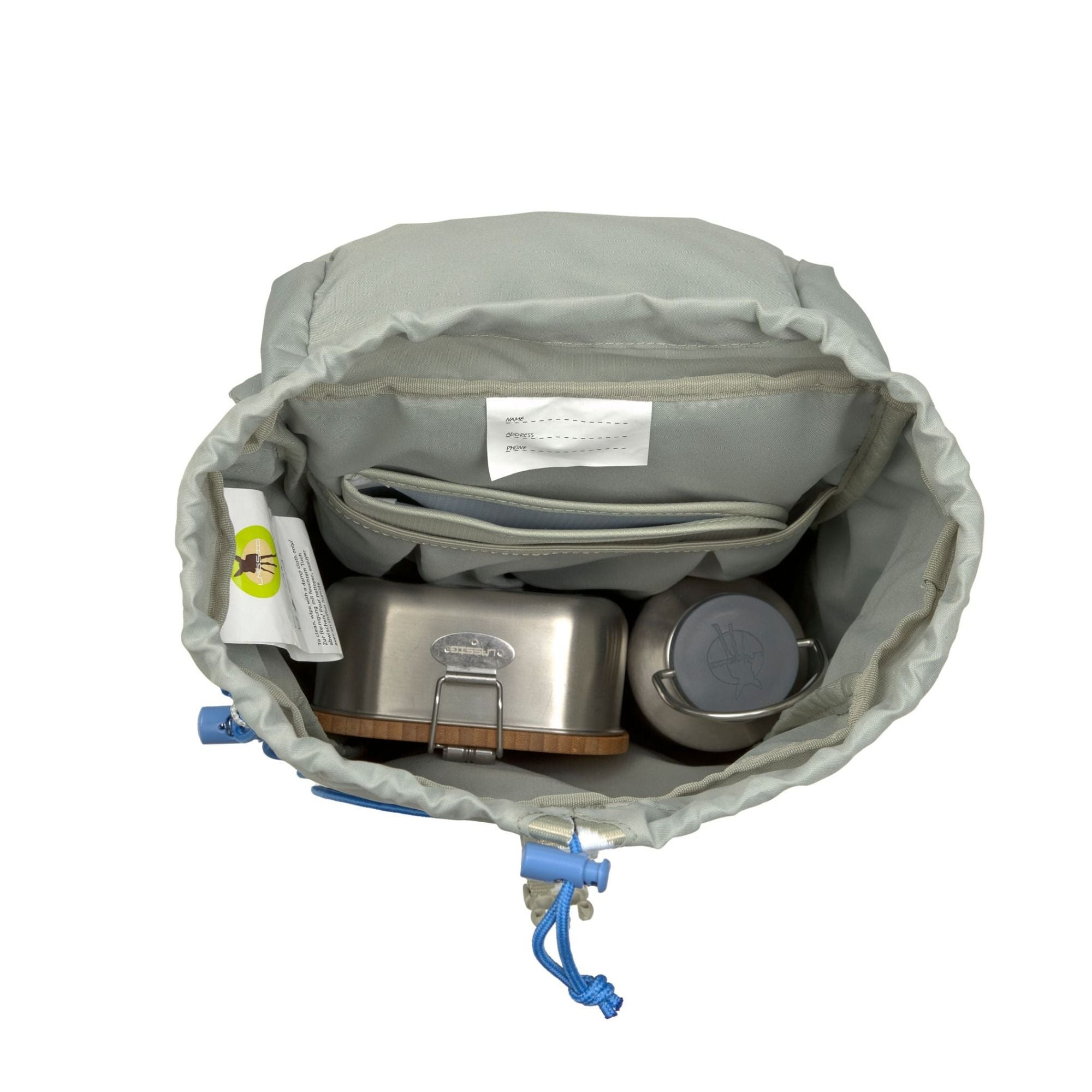 - Namensschild auf der Innenseite des Rucksacks