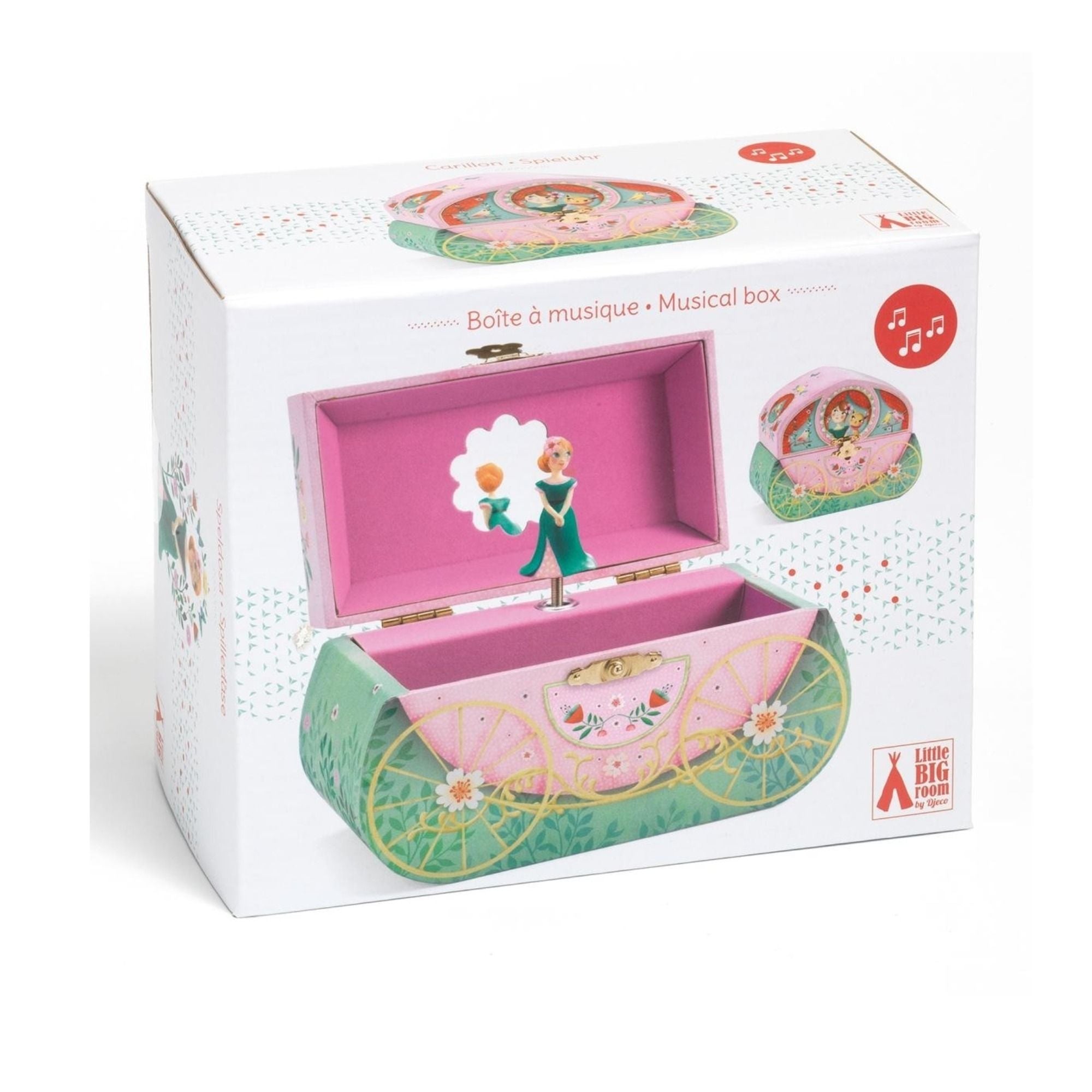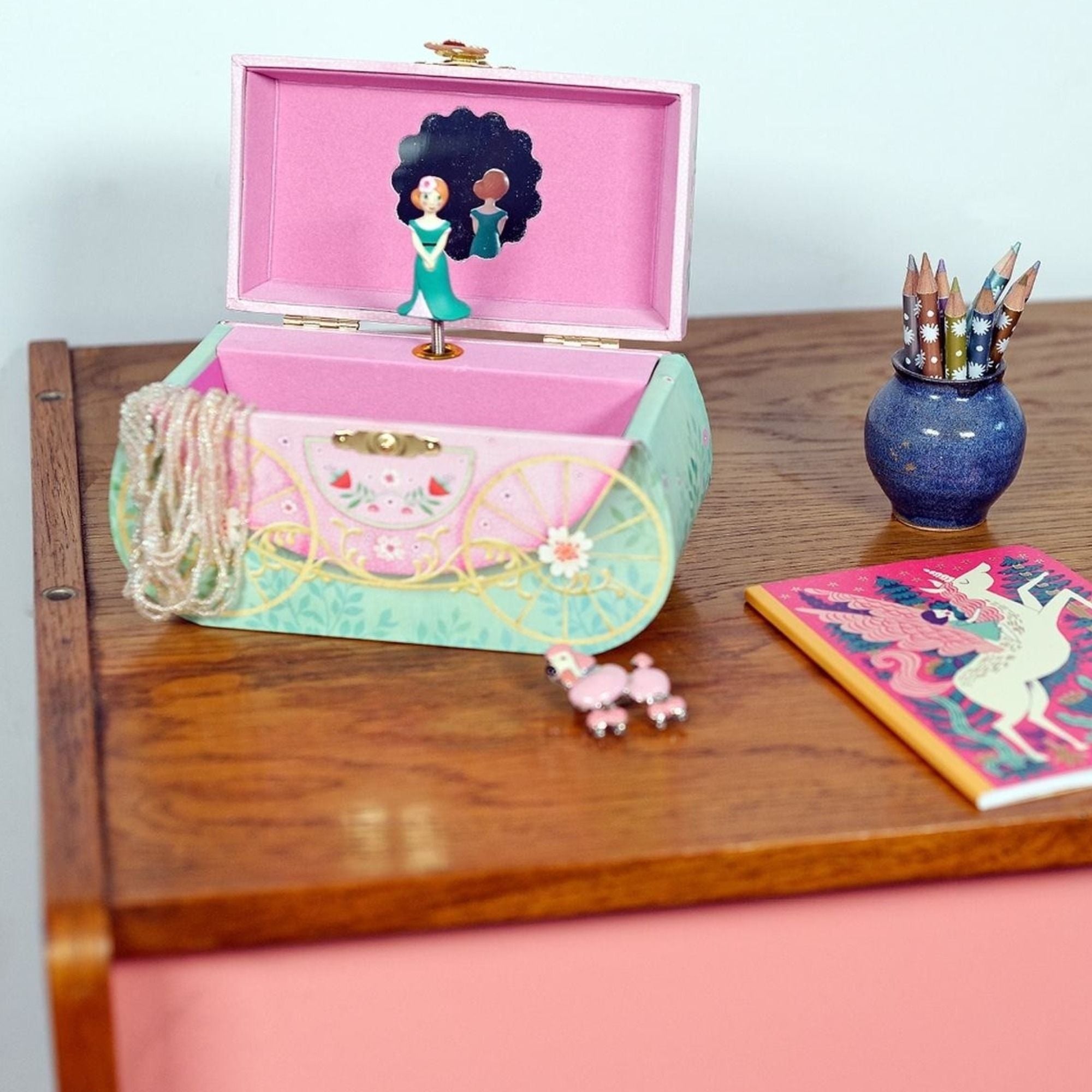 Ausflug in der Kutsche ist eine hübsch verzierte Spieluhr in Form einer Kutsche zur Aufbewahrung von Schmuck und kleinen Schätzen. Schüssel aufziehen, Dose öffnen und tada: Überraschung! Eine liebevoll gestaltete Prinzessin dreht sich zur Melodie von „Let Me Call You“ von Leo Friedman und spiegelt sich in einem schön geformten Spiegel.