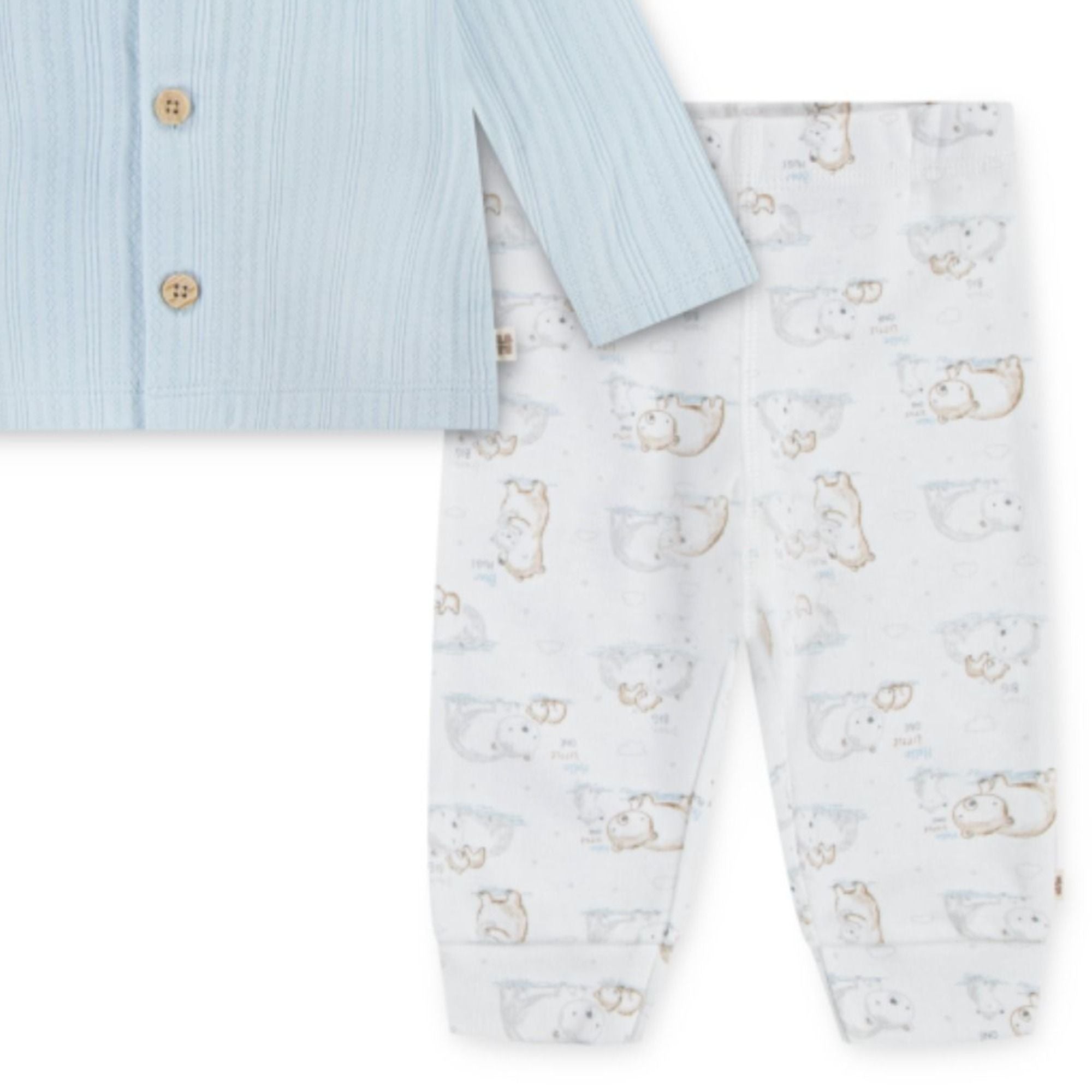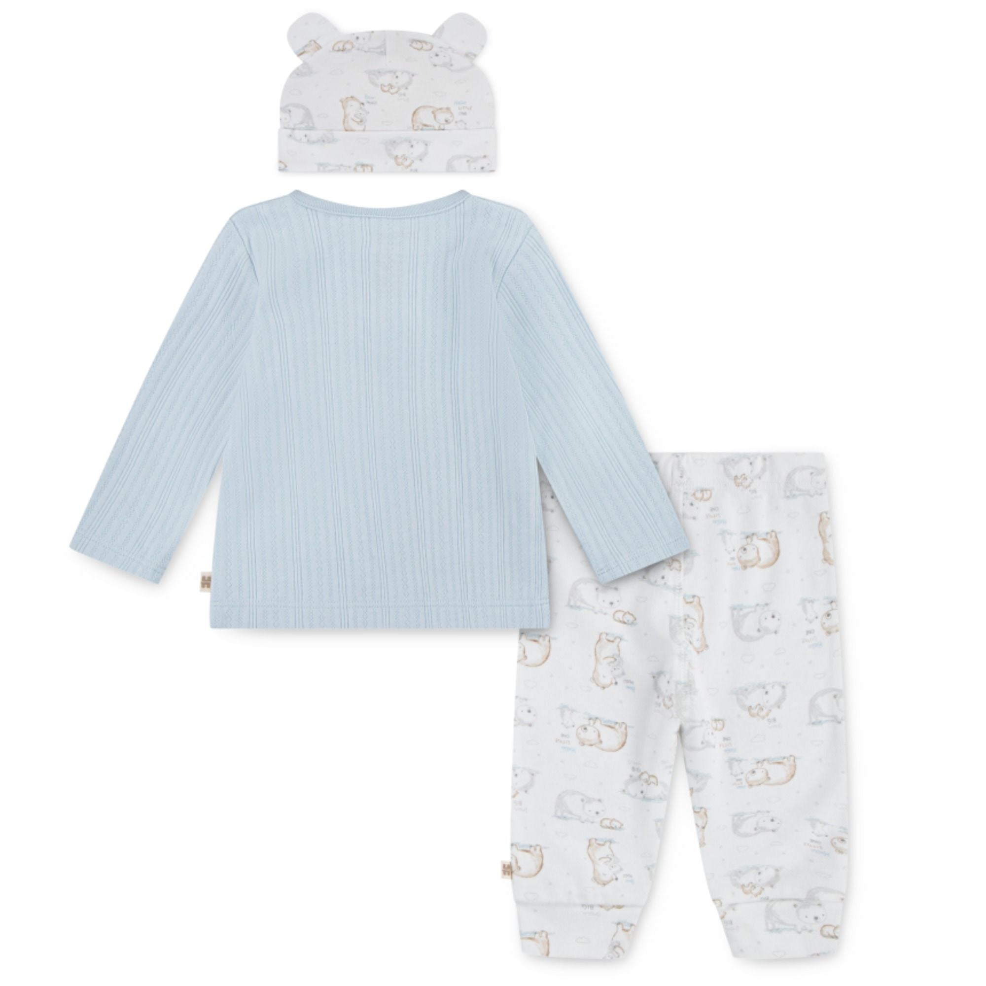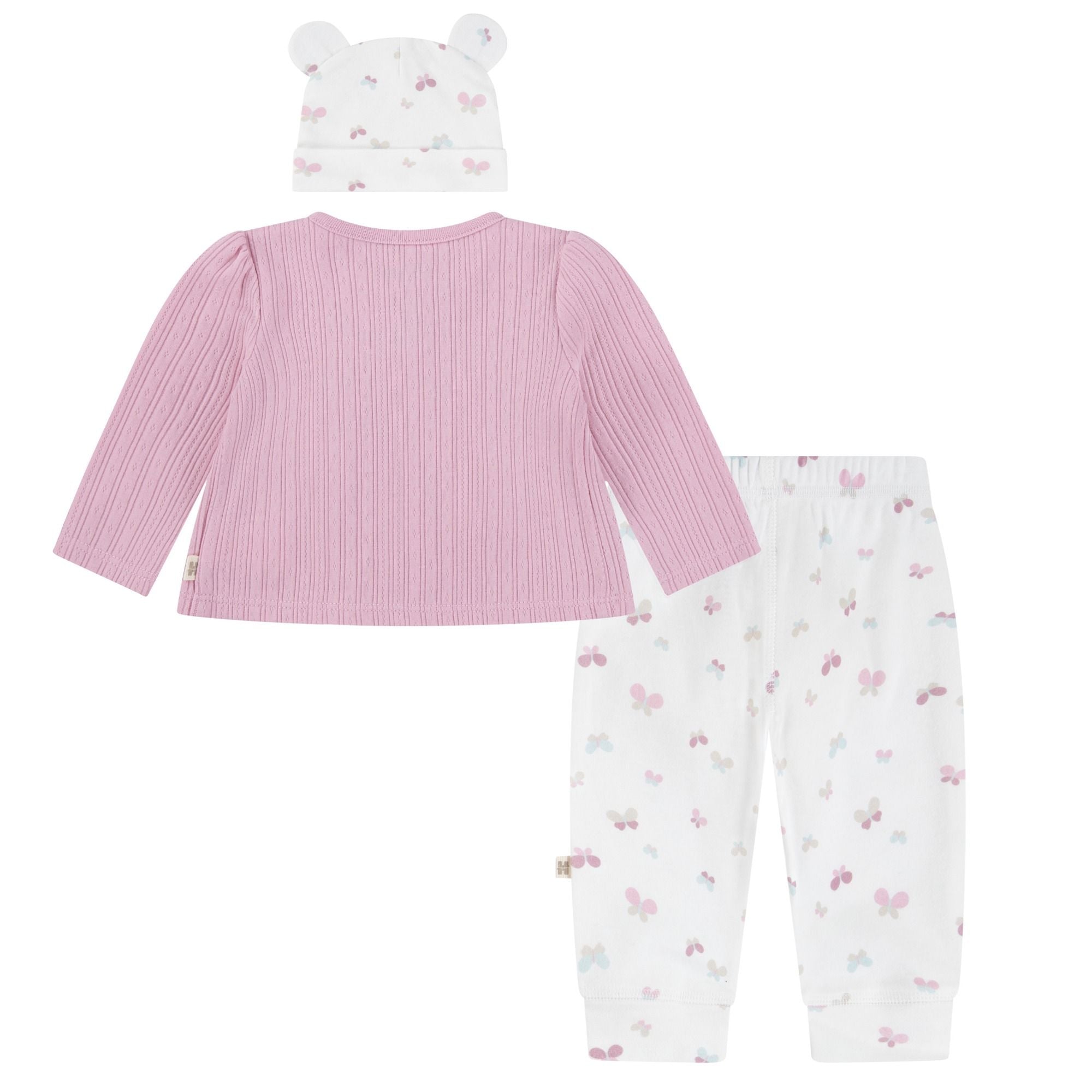Dieses niedliche Baby-Set besteht aus einem luftigen Cardigan mit Holzknöpfen, einer komfortablen Hose mit sanftem Bund und einer passenden Mütze mit Ohren. Die weiche Rippstruktur des Oberteils kombiniert sich perfekt mit der glatten Maschenqualität der Hose und Mütze – für ein rundum angenehmes Tragegefühl. Ideal für empfindliche Babyhaut und ein stilvoller Alltagsbegleiter aus 100% Bio-Baumwolle.