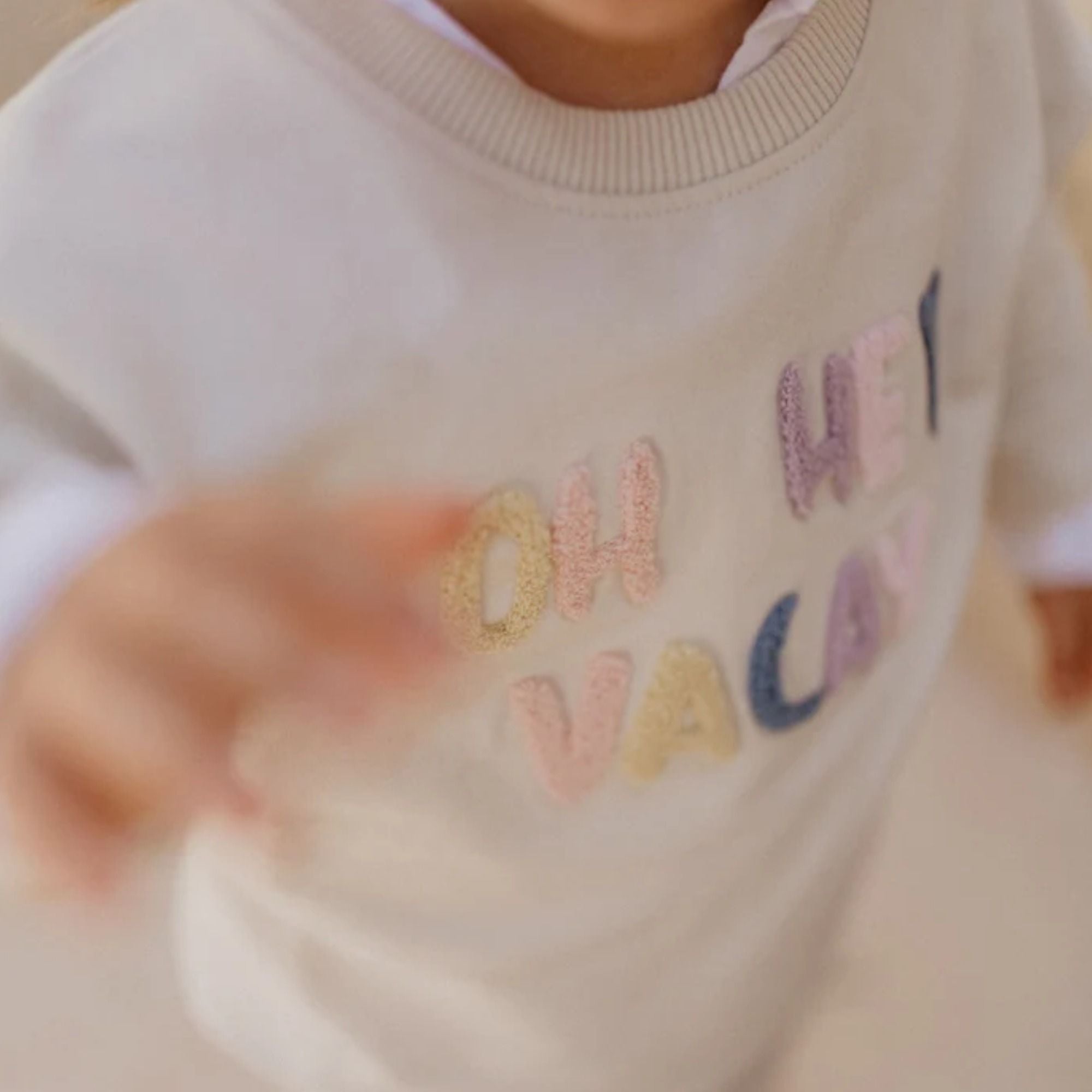 Dieses gemütliche Oversized-Sweatshirt ist perfekt für kleine Abenteurer! Gefertigt aus weichem, angerautem Sweatstoff, sorgt es für ein angenehmes Tragegefühl. Die hochwertige Stickerei "Oh Hey Vacay" verleiht dem Pullover einen lässigen und sommerlichen Look.
