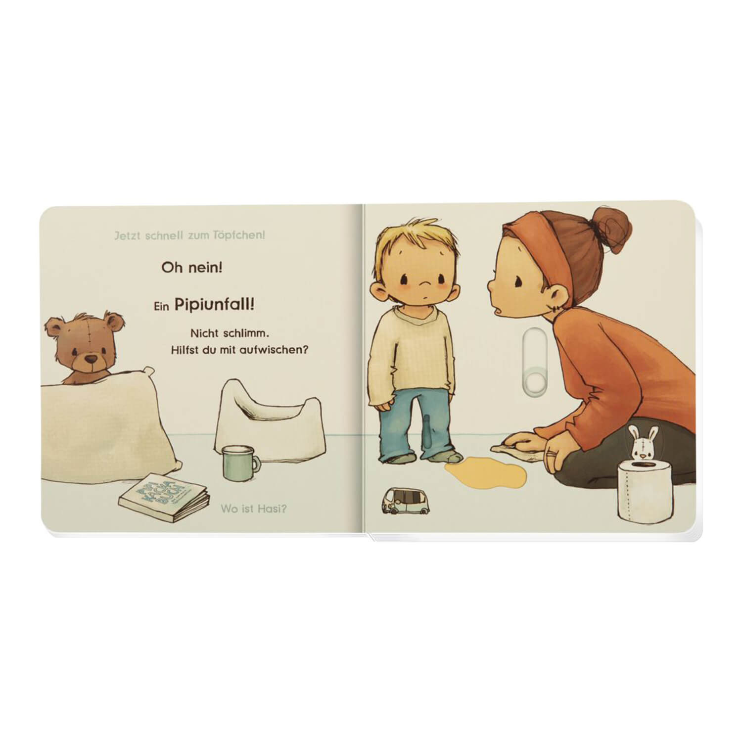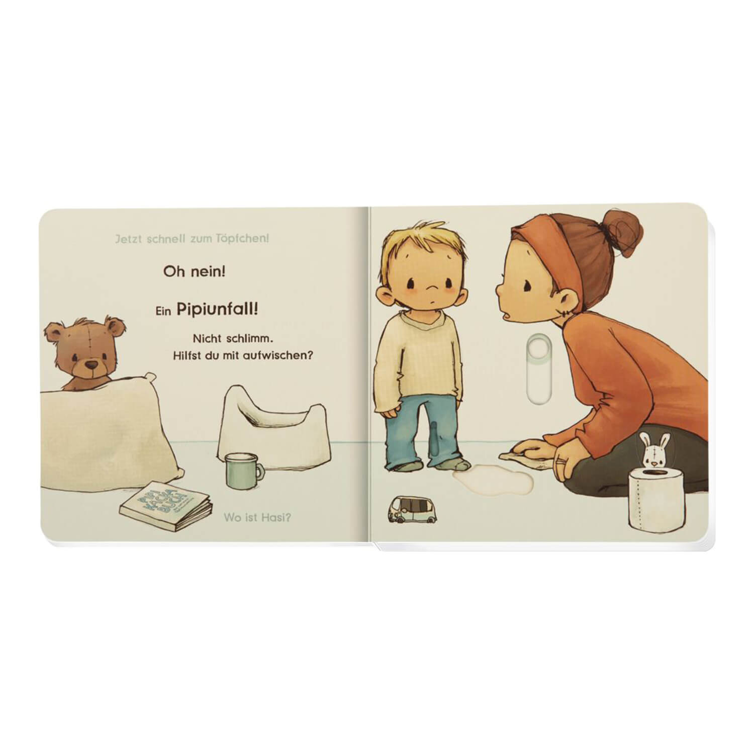 Das Essen kommt oben rein und unten wieder raus. Dank vieler Schieber und Klappen ist dieses besondere Pappbilderbuch die anschaulichste Töpfchenlektüre der Welt! Pipi machen, abputzen, abspülen, Hände waschen, fertig! Und wer findet Hasi auf jeder Seite? Ein Bilderbuchvergnügen zum Immer-wieder-Anschauen und Mitspielen! Text und Illustration von Joëlle Tourlonias.