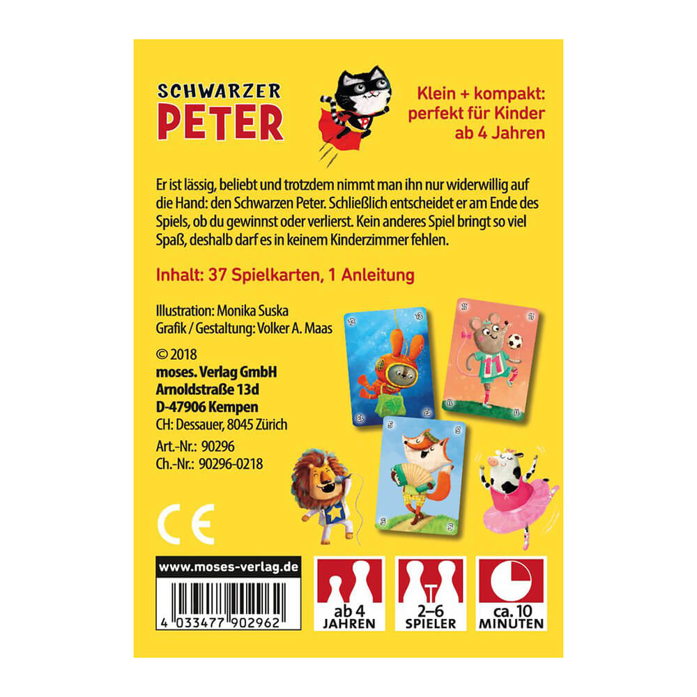 Er ist lässig, beliebt und trotzdem nimmt man ihn nur widerwillig auf die Hand: den schwarzen Peter! Das hat er eigentlich nicht verdient. Denn bis heute ist Schwarzer Peter eines der beliebtesten Kinderkartenspiele. Kein anderes Spiel bringt so viel Spaß - und darf in keinem Kinderzimmer fehlen. Das Spiel kommt in einer kleinen, kompakten und praktischen Metalldose und ist das perfekte Geschenk für Kinder ab 4 Jahren. Zusätzlich aufgepeppt wird das Spiel durch die umwerfend schönen Illustrationen von Monika Suska. So will gleich jeder den Schwarzen Peter gerne auf der Hand haben - oder besser nicht, denn Verlieren möchte dann ja doch keiner ;-)