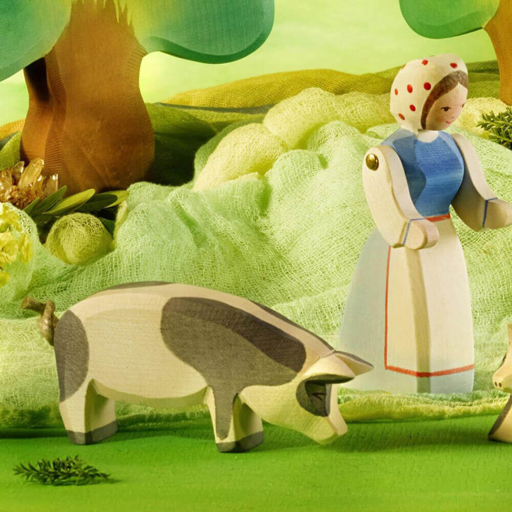 Das gefleckte Schwein wird in reiner Handarbeit aus Ahornholz hergestellt und mit ausgesuchten Spielzeugfarben bemalt. Er gehört mit zur großen Ostheimer Familie und fördert das Freie Spiel und lässt Raum zur Entfaltung der eigenen Fantasie.