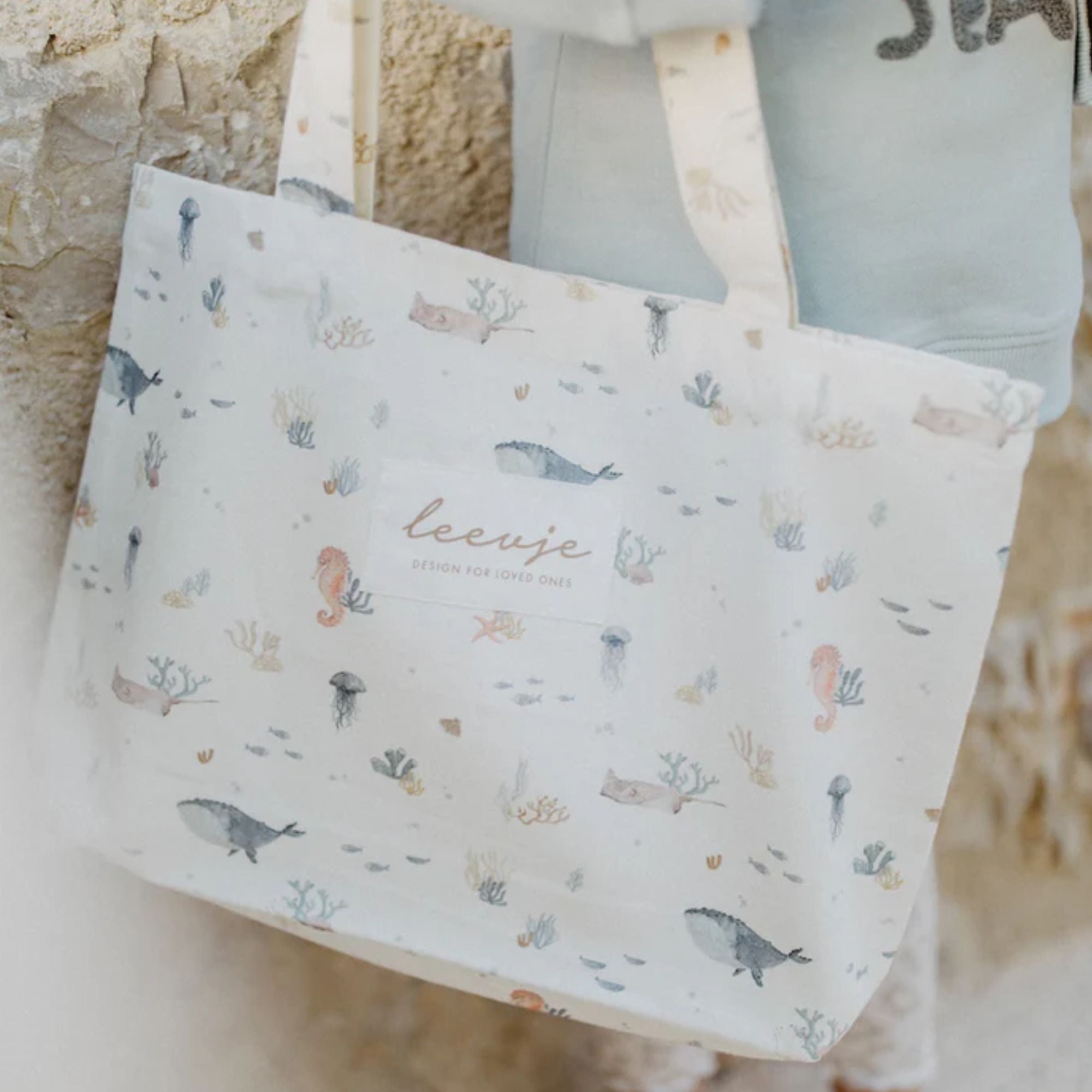 Dieser liebevoll gestaltete Stoffbeutel bringt die Magie des Meeres in den Alltag. Mit seinem verspielten Meereswelt-Print erinnert er an Muscheln, Wellen, Korallen und mehr. Perfekt für kleine Abenteurer, die ihre liebsten Schätze immer dabeihaben möchten.
